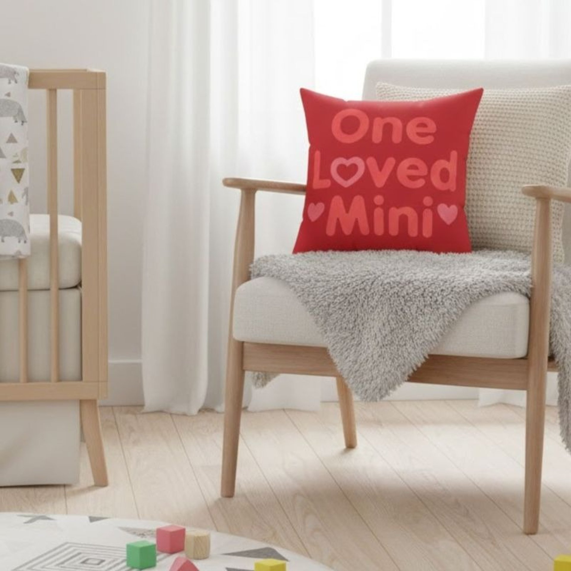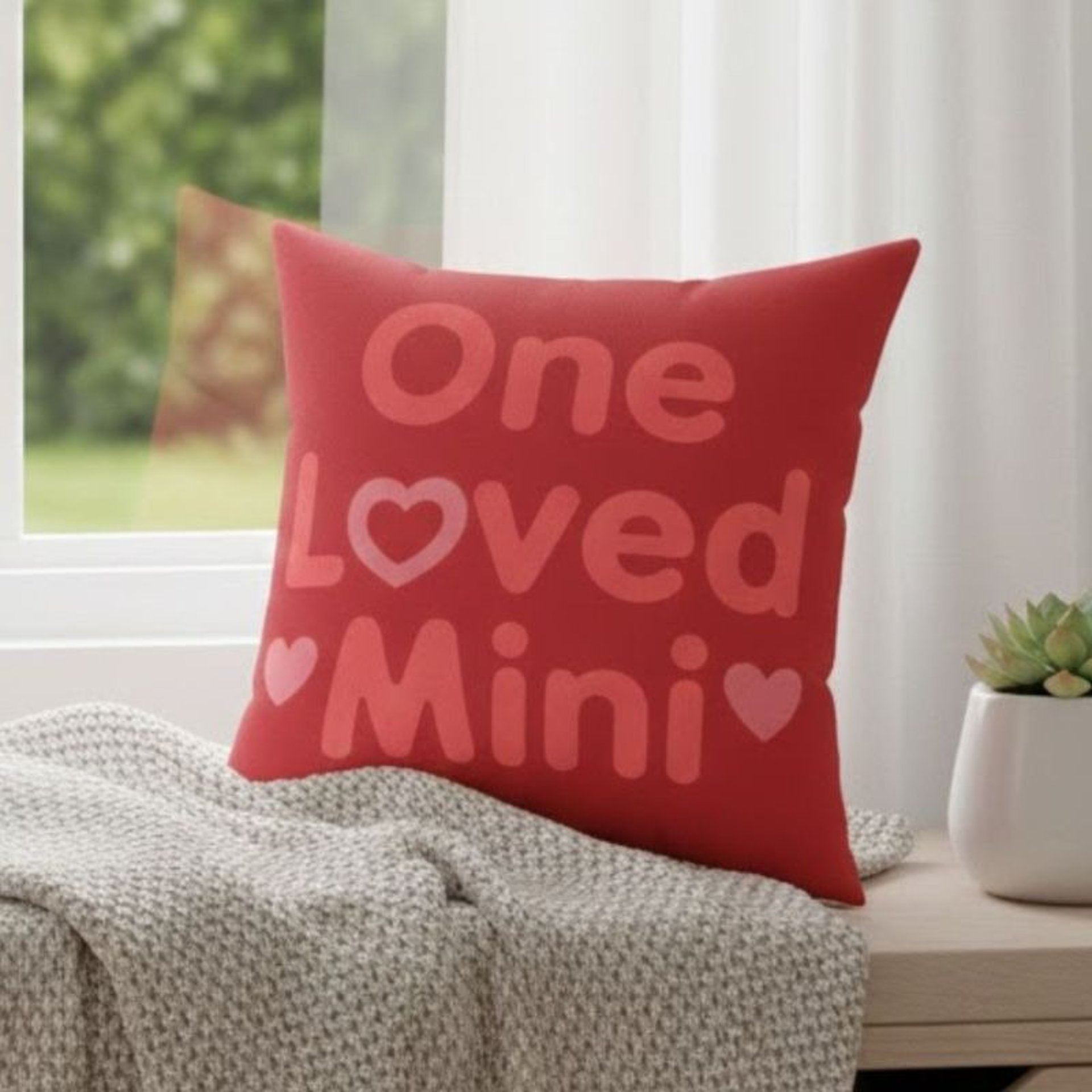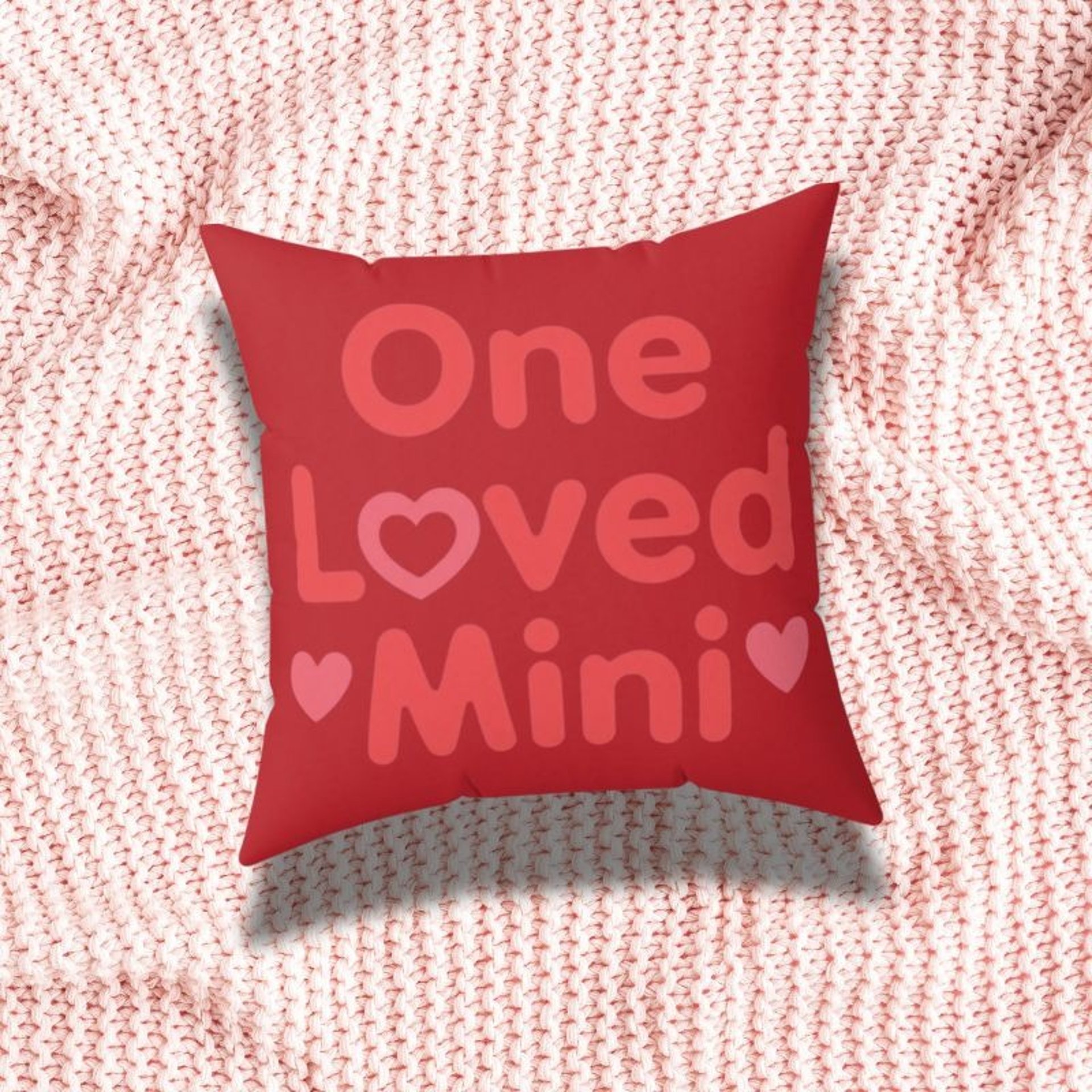 This One Loved Mini Pillow Decorative Throw Pillow pillow brings warm, playful love to any cozy corner. Soft spun polyester holds a bright red background with rounded letter text.