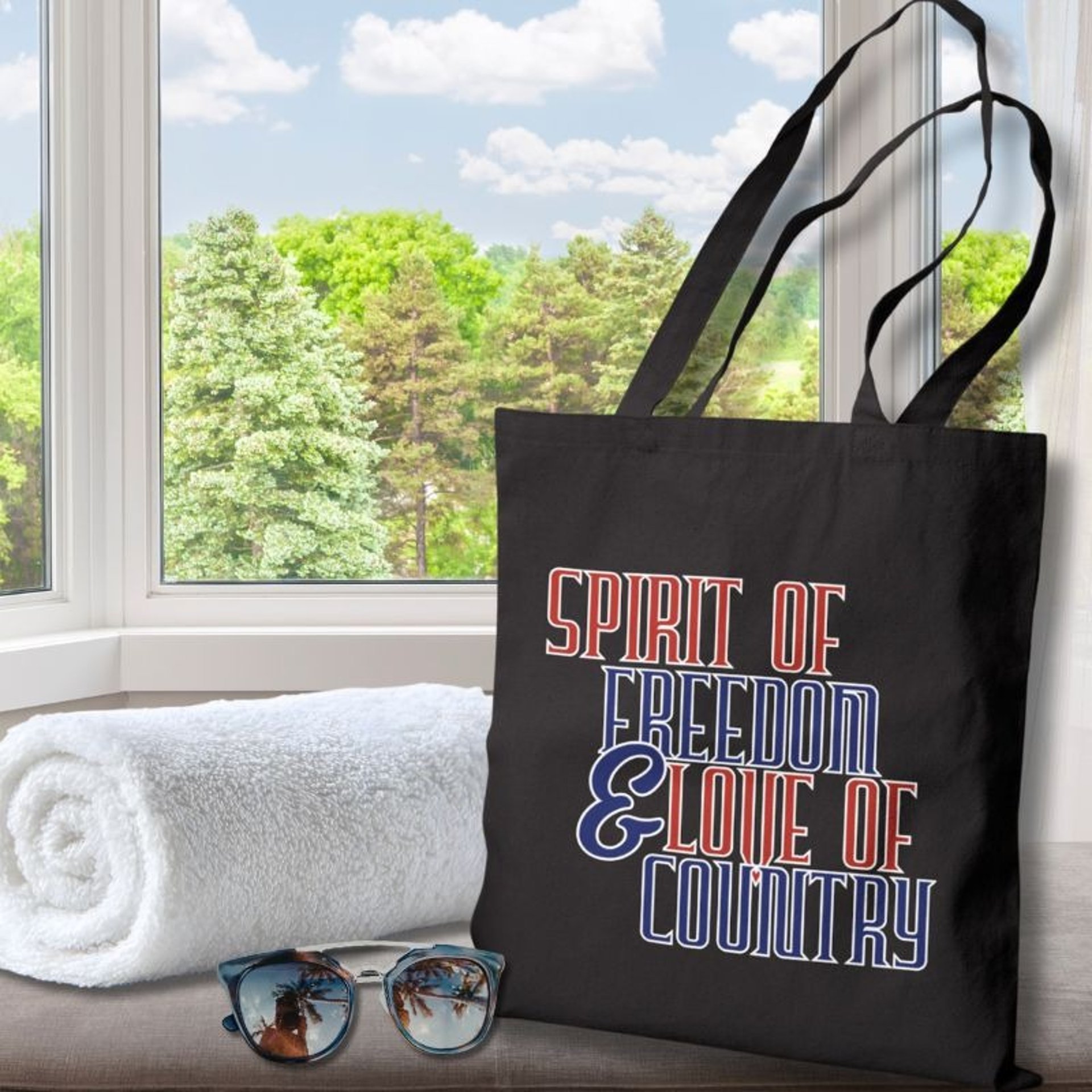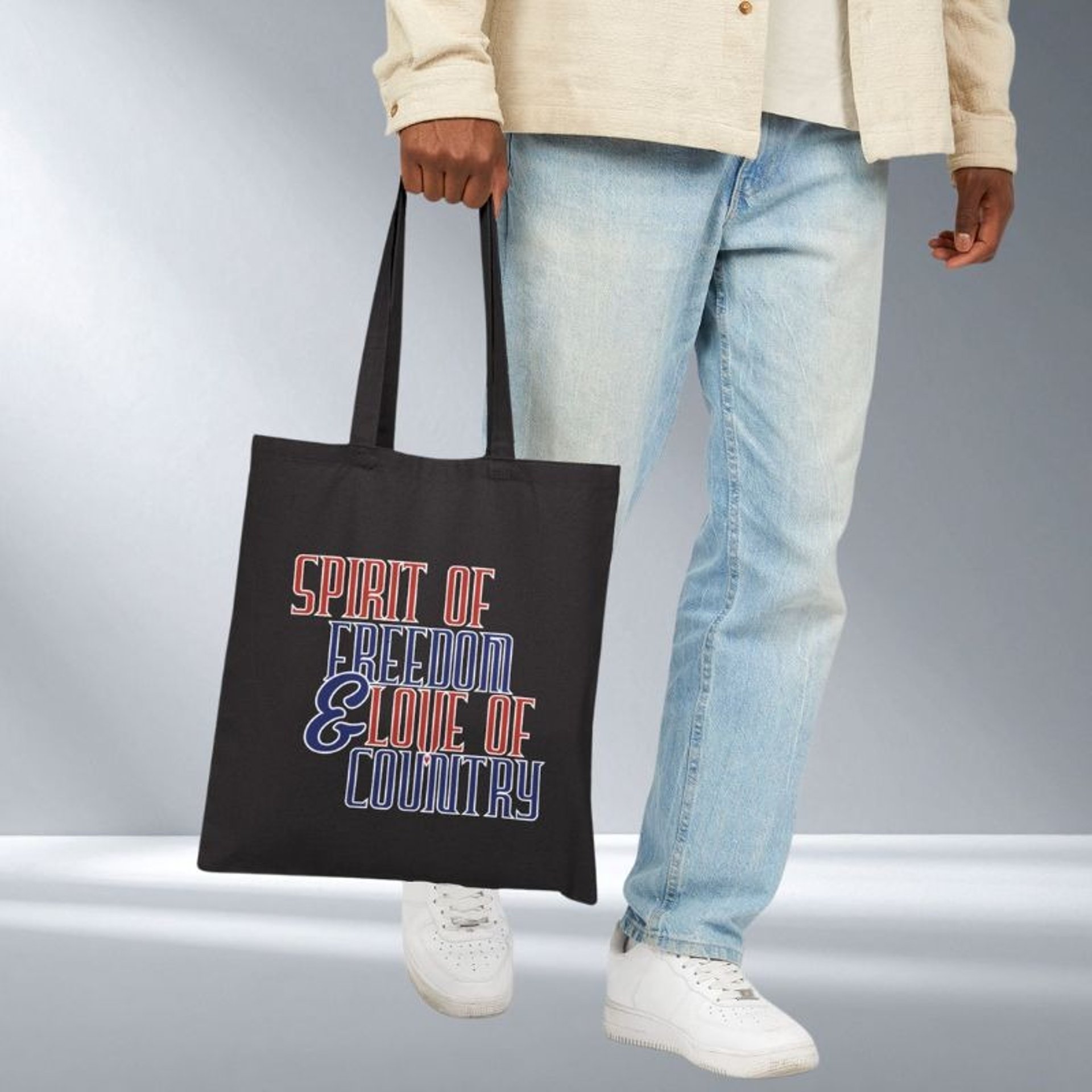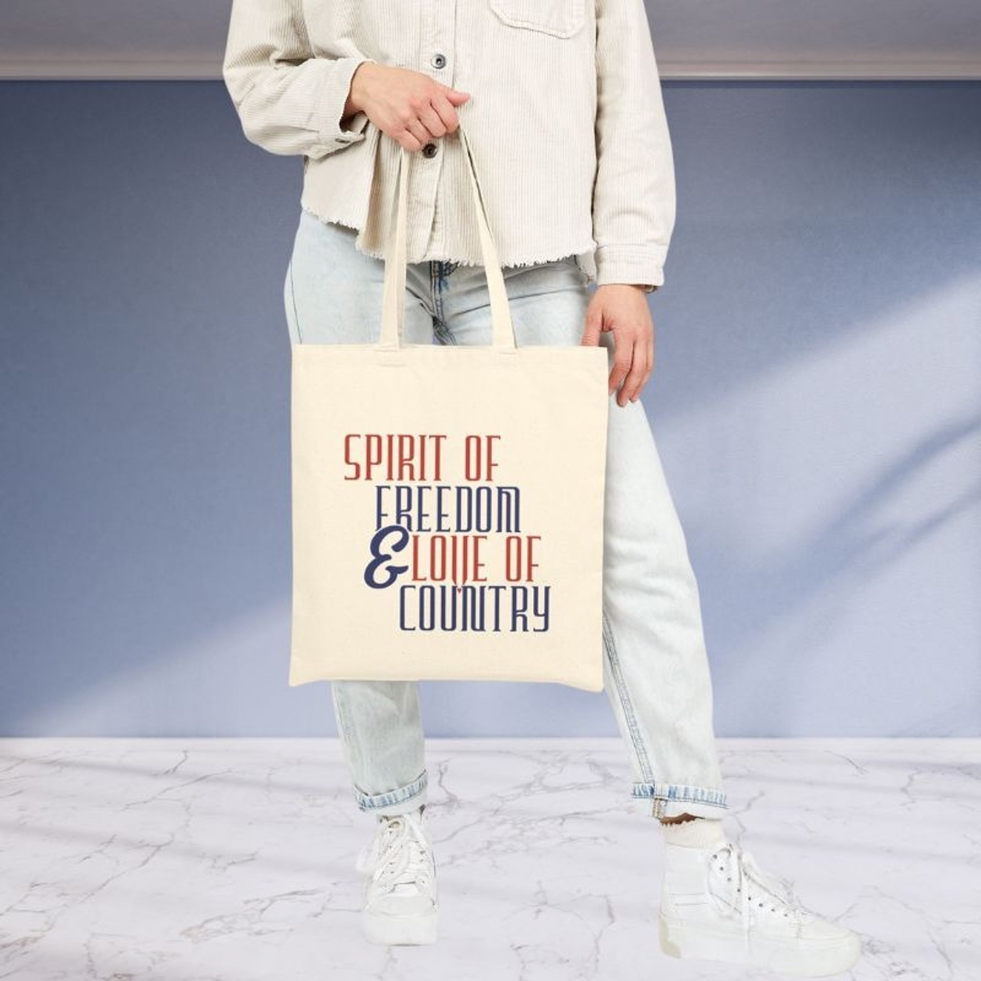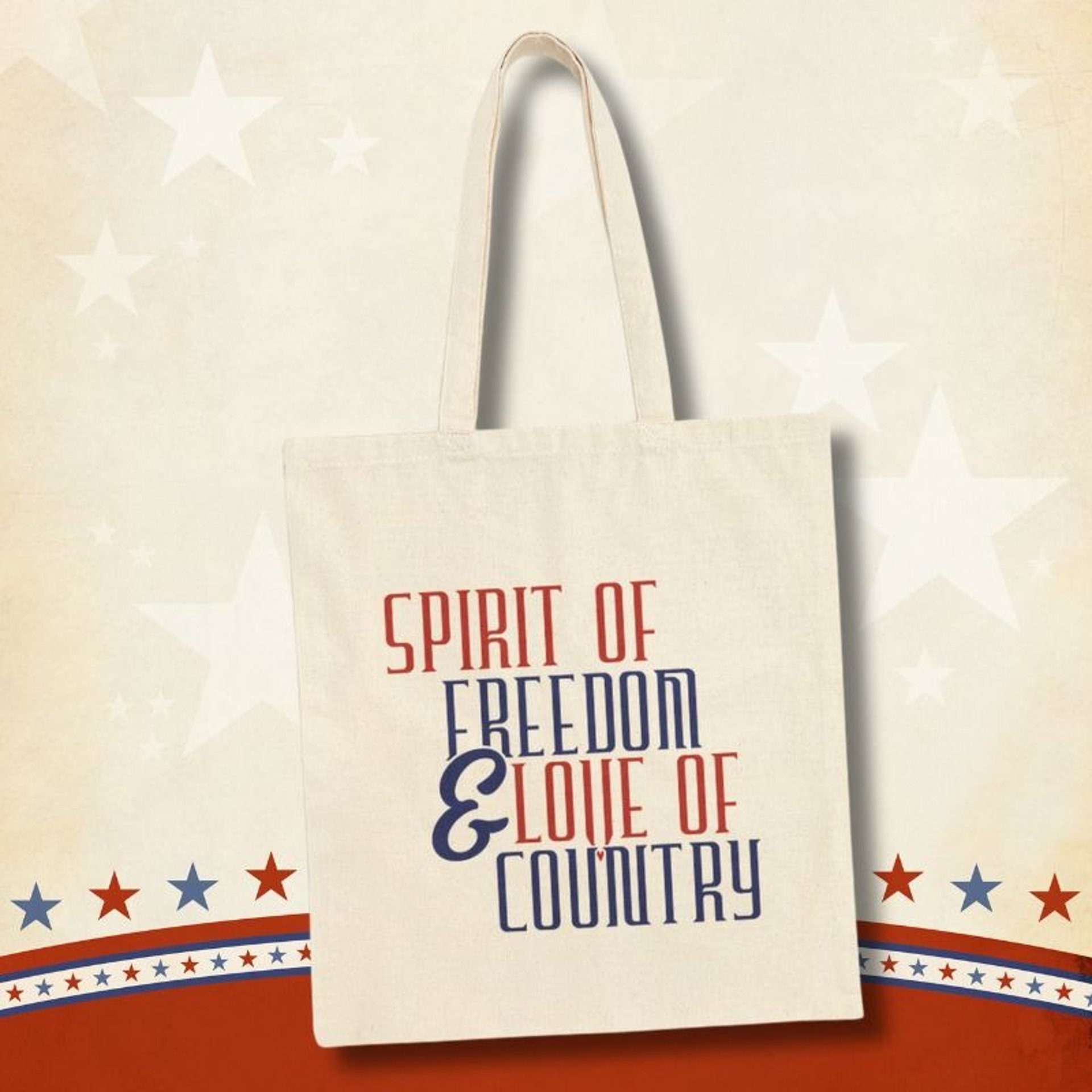 Canvas cotton tote stamped with a patriotic vintage-style slogan that reads like a roadside anthem. The heavyweight cotton feels sturdy in hand and keeps its rectangular shape whether you’re hauling books, groceries, or a picnic for two.